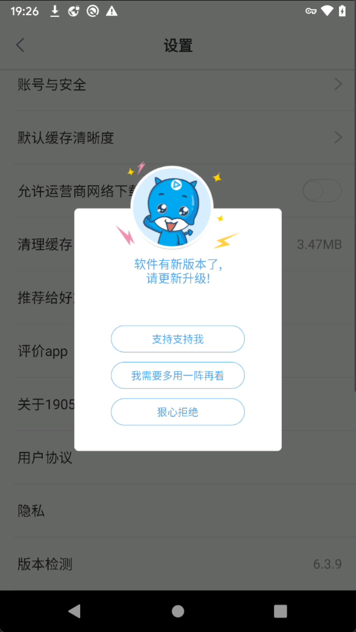 在设置界面,我们点击一下版本检测,便会弹出更新弹窗