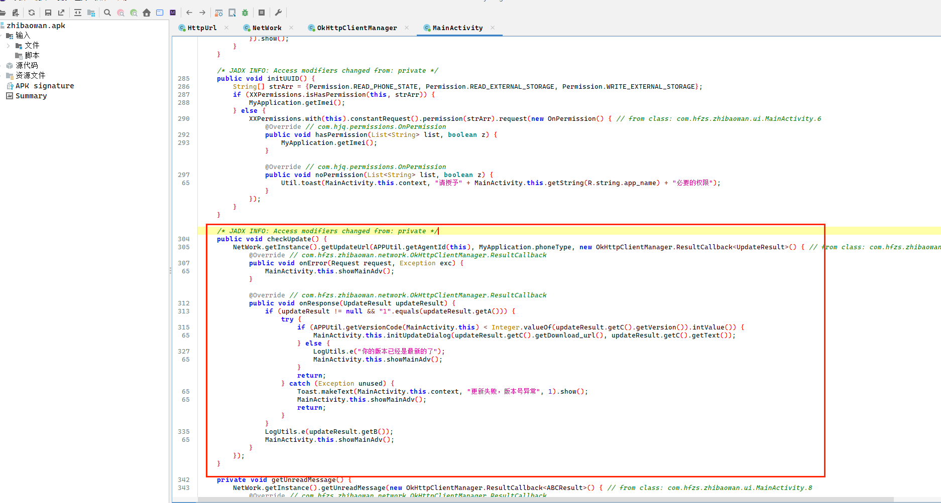 看到了检查更新的字段,说明这个app是通过服务器来检查更新的,查壳发现这个app也是没有壳的,于是想到,我们直接使用jadx反编译这个app然后搜索这个post字段,hook掉发包即可